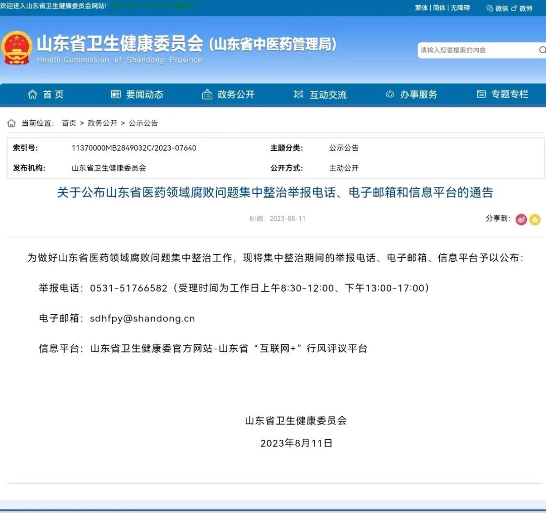 山東省衛生健康委員會官方網站發布《關于公布山東省醫藥領域腐敗問題集中整治舉報電話、電子郵箱和信息平臺的通告》,全文如下: