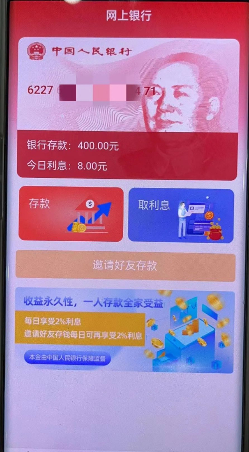 浙江遂昌市民賴某在某社交平臺看到一則廣告,廣告里的內(nèi)容非常吸引人,用高額的利息回報吸引著閱讀者,于是賴某按照廣告內(nèi)的地址下載了假冒的“中國人民銀行”APP,并投入四百元本金試水,本以為按2%的利息,每天盈利8元的收益躺賺,但后來根本無法提現(xiàn),賴某發(fā)現(xiàn)自己被騙,于是報了警。