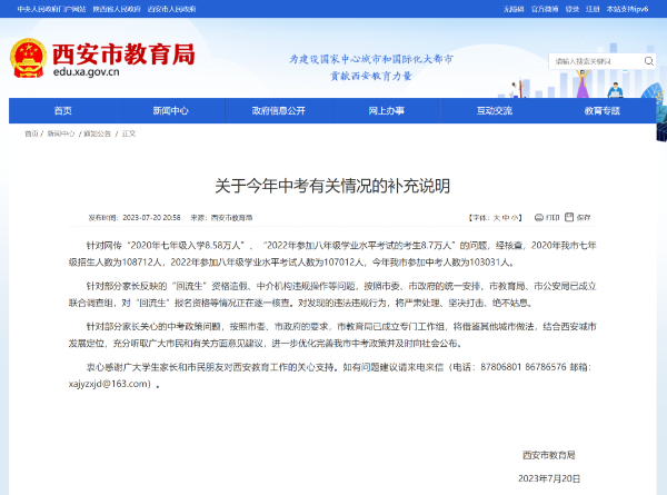 7月20日,西安市教育局官網發布《關于今年中考有關情況的補充說明》,全文如下: