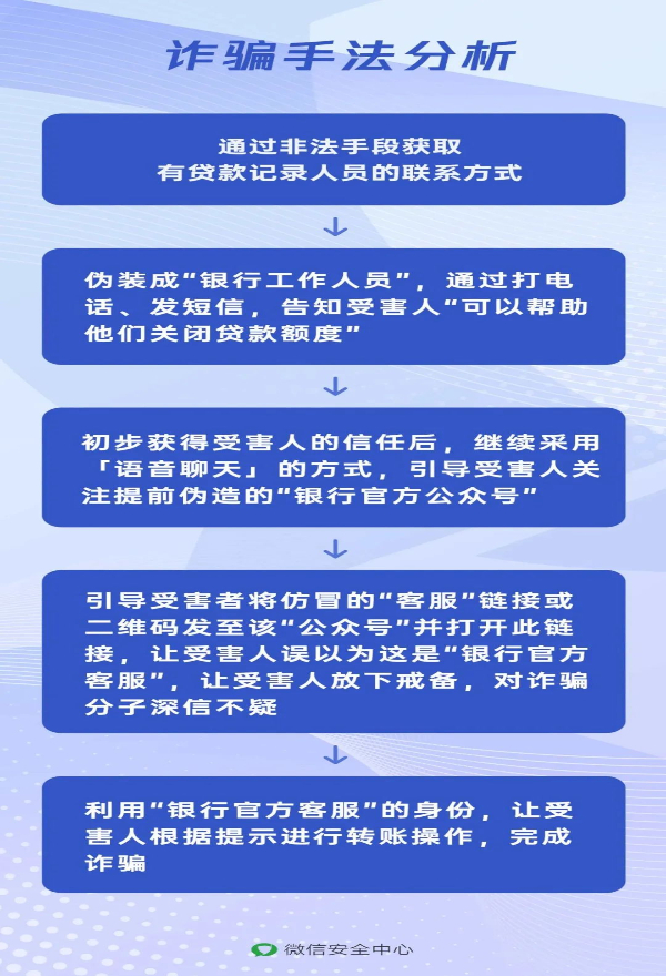 近期,平臺發現有詐騙團伙向用戶發送詐騙短信,以可以抹除網貸額度、修復征信等為噱頭,在溝通過程中要求用戶先關注銀行等機構的官方公眾號,引導用戶將仿冒的“中國人民銀行征信中心”等官方客服鏈接或二維碼發送到該公眾號內并點擊打開,部分用戶誤認為該欺詐鏈接就是相關公眾號的官方客服,從而上當受騙。