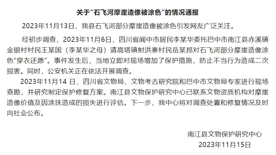 11月15日凌晨,南江縣文物保護研究中心發布通報稱,經初步調查,2023年11月6日,四川省閬中市居民李某華委托巴中市南江縣赤溪鎮金銀村村民王某國(李某華之母)請高塔鎮射洪寨村民岳某邦對石飛河部分摩崖造像涂色“穿衣還愿”。事件發生后,當地立即對現場增加了保護措施,防止不當行為造成二次損害。同時,公安機關正在依法開展調查。