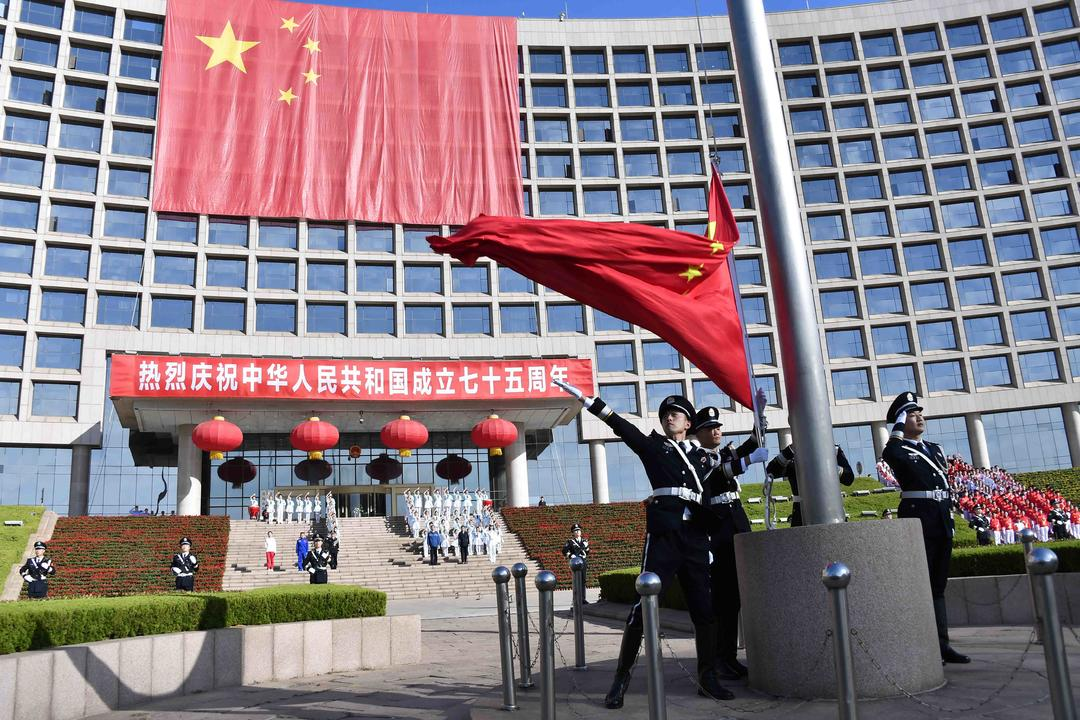 10月1日上午,青島市在市級(jí)機(jī)關(guān)1號(hào)辦公樓前廣場(chǎng)隆重舉行升國(guó)旗儀式,社會(huì)各界代表、市民群眾2000余人參加,共同禮贊新中國(guó),聚力建功新時(shí)代。