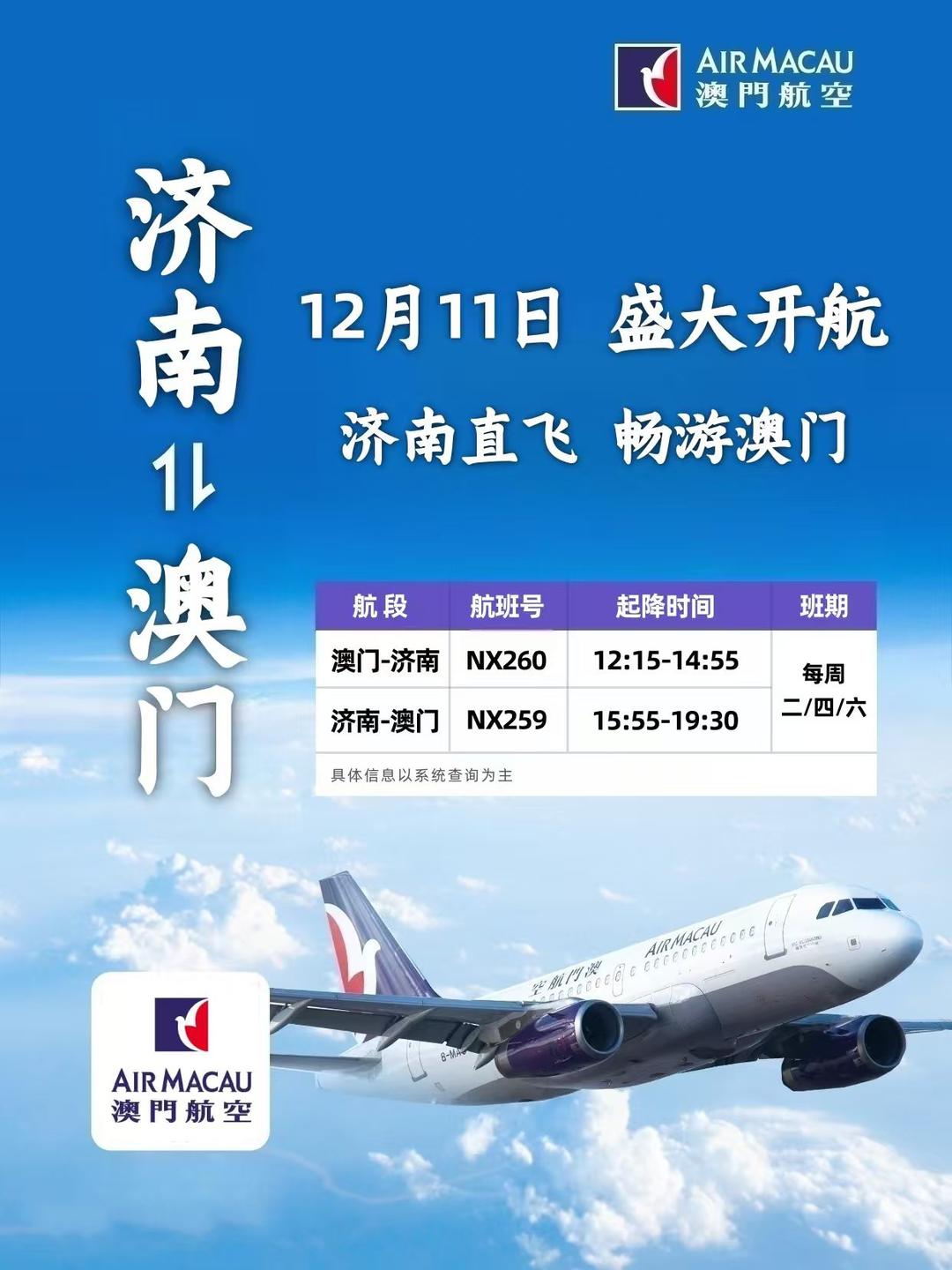 澳門(mén)航空成立于1994年,以“根植澳門(mén)、服務(wù)澳門(mén)”為宗旨,始終踐行“厚載文化、用心飛翔”的服務(wù)理念。致力于搭建連接世界與中國(guó)澳門(mén)的空中網(wǎng)絡(luò),推動(dòng)區(qū)域互聯(lián)互通。此次濟(jì)南航線將融合中國(guó)澳門(mén)溫情與山東熱情,為旅客提供全流程高品質(zhì)服務(wù),該航線的開(kāi)通,也是其服務(wù)國(guó)家戰(zhàn)略、助力區(qū)域協(xié)同發(fā)展的重要舉措。