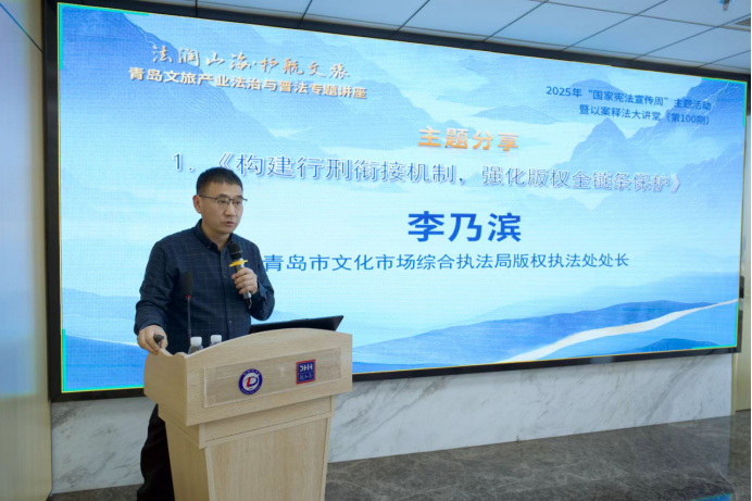 青島市文化市場綜合執法局執法二大隊大隊長李乃濱結合近年來青島市文旅、版權市場執法典型案例,系統闡述了在新業態侵權復雜化、產業化背景下,青島市創新版權治理模式的實踐路徑與制度成果。講座還重點介紹了由文化執法、公安、檢察、法院協同構建的行刑銜接機制。該機制通過常態化案件通報、線索移送與數據共享,實現了行刑有效銜接,是全市推進版權治理現代化、服務文旅產業高質量發展的重要制度創新。