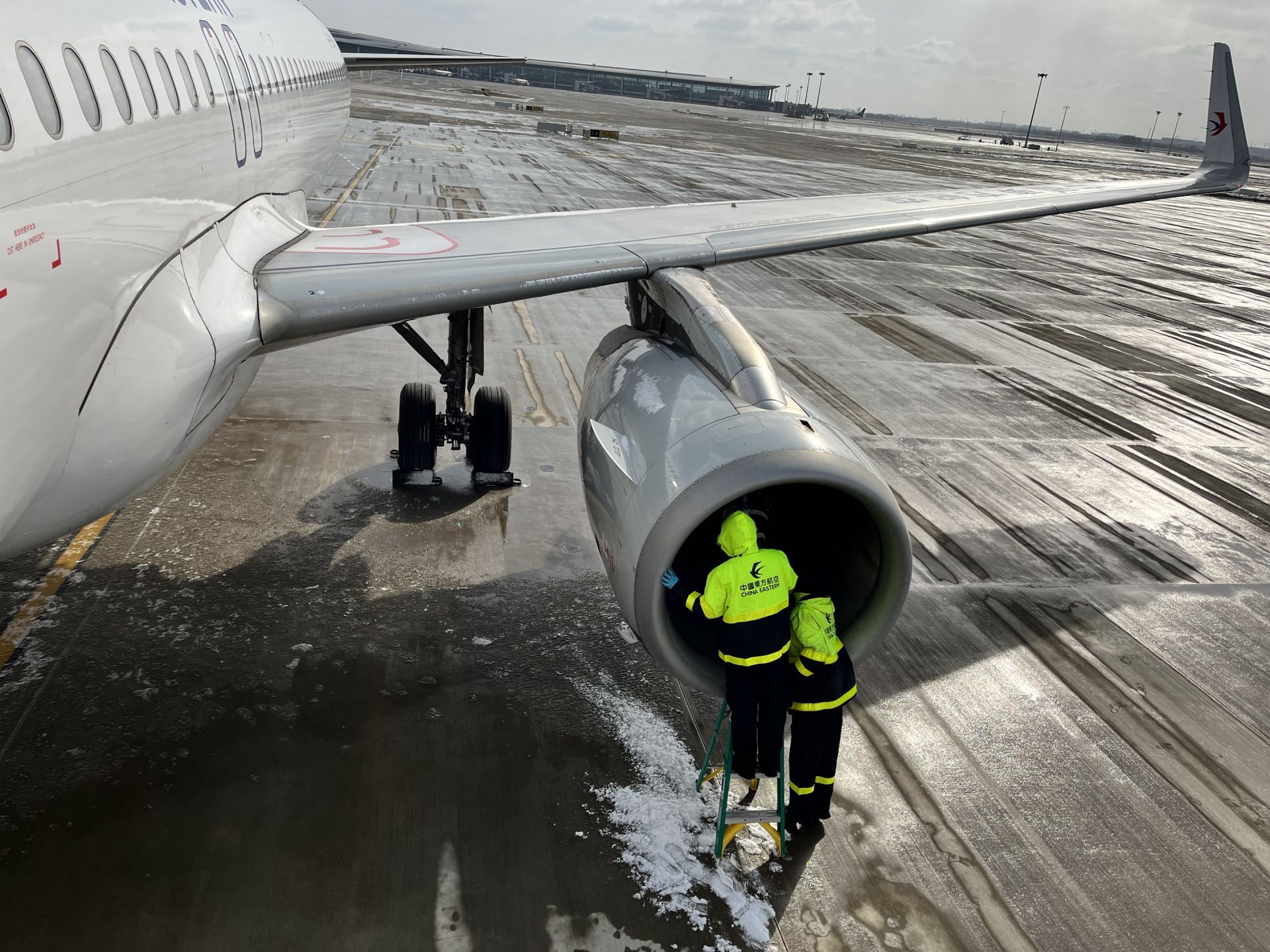 東航技術山東分公司提前部署,安排備份力量待命,進一步加強對飛機的全面細致檢查,重點做好出港航班除防冰作業,確保飛機關鍵部位無積雪、霜及結冰。機務人員堅守在風雪中,不畏嚴寒,嚴格把守放行關,確保每一架飛機都能以最好的狀態運行。