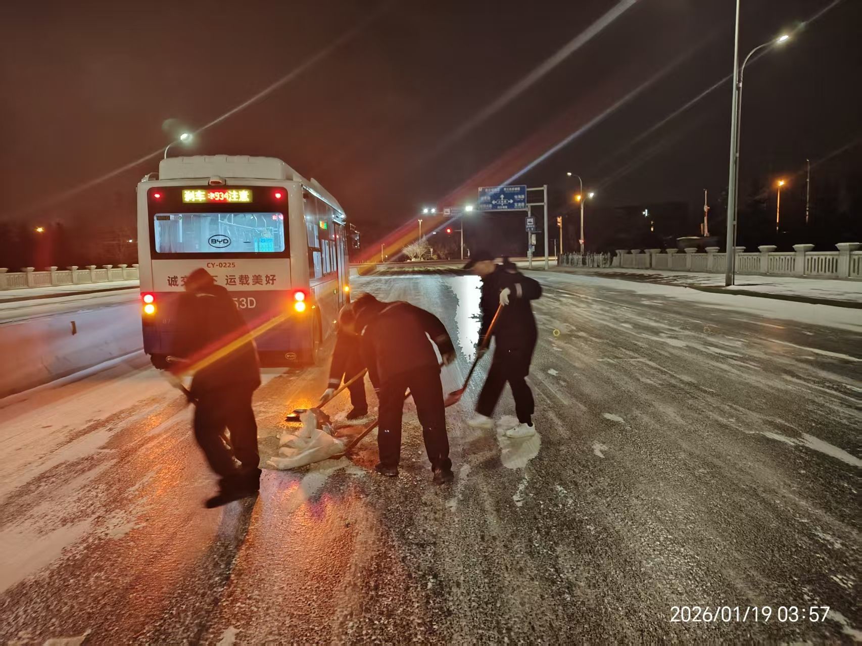 1月18日,隨著降雪持續,公司立即啟動惡劣天氣應急預案。15支應急突擊隊、229名隊員全員出動,按照“一線一策”方案,對全部運營線路開展全覆蓋隱患排查,重點在易結冰路段、站點周邊拋灑融雪劑、鋪設防滑沙、清掃積雪。截至19日早間,已累計拋灑融雪劑11噸。