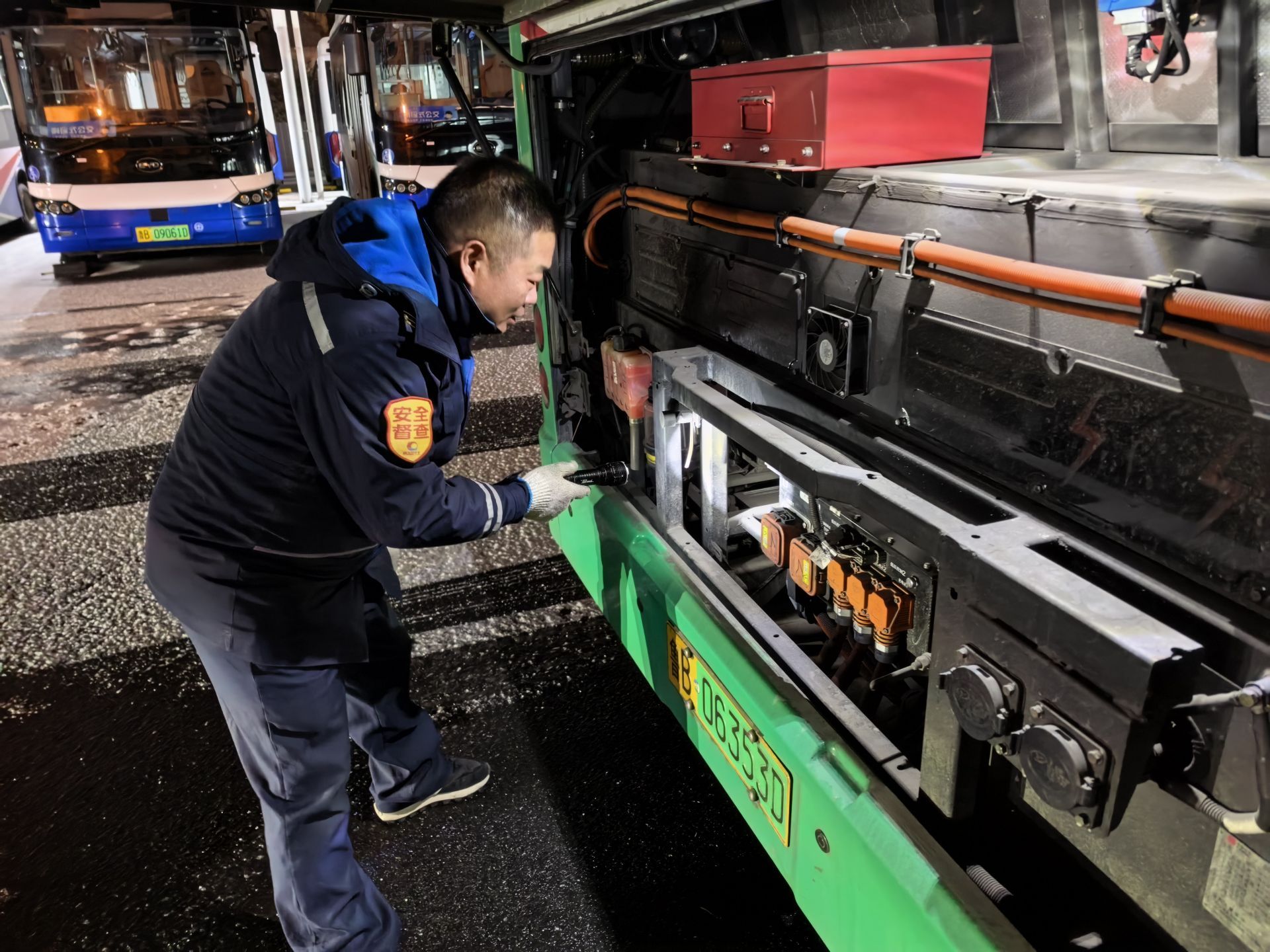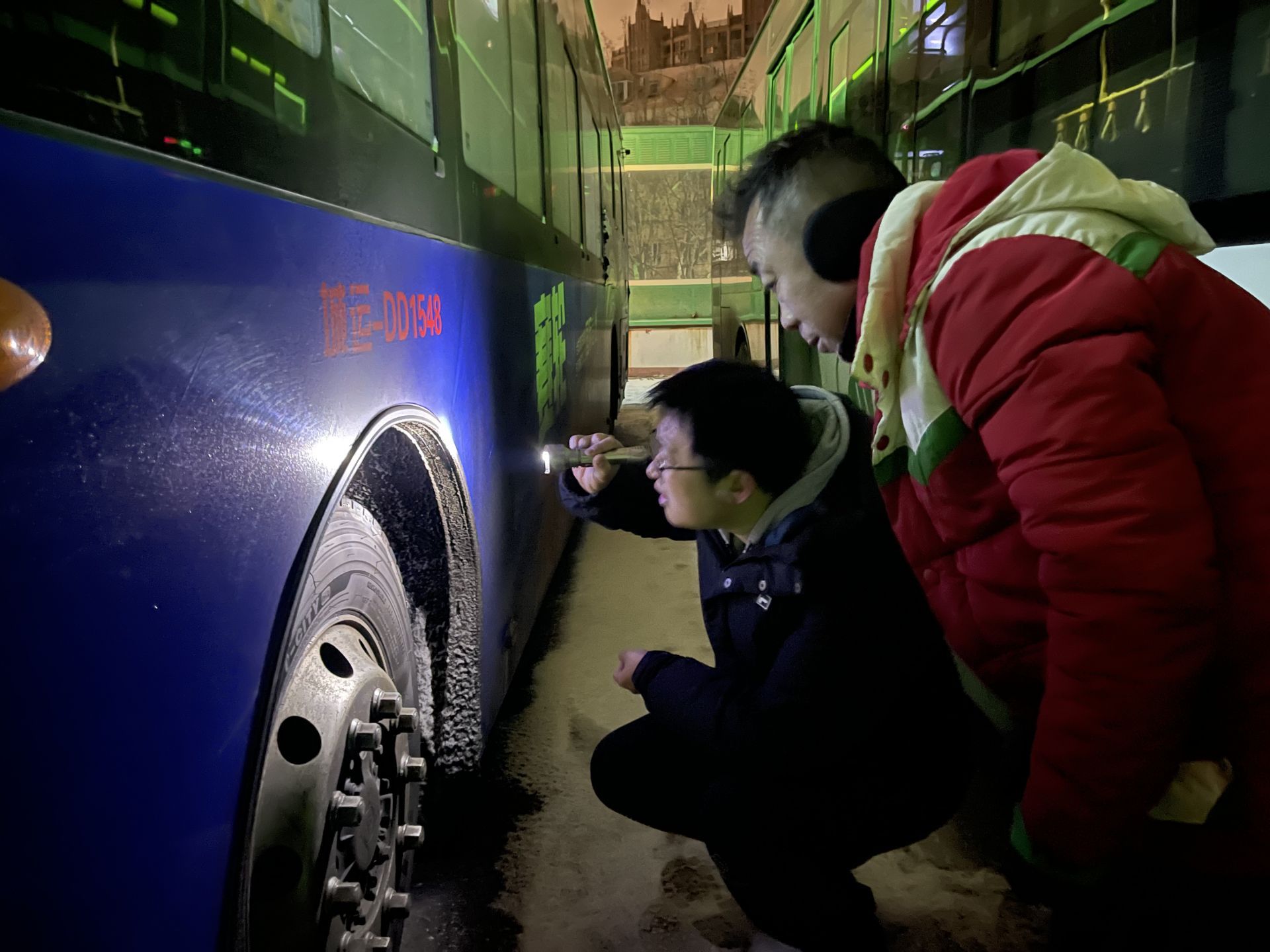 為確保早高峰公交運力,隧道巴士公司技術保障人員與頭班車駕駛員提前到崗,逐車檢查車輛制動、轉向、暖風等系統性能。同時,所有出場車輛都完成了車身積雪清理、反光鏡擦拭和車窗除霜等工作。