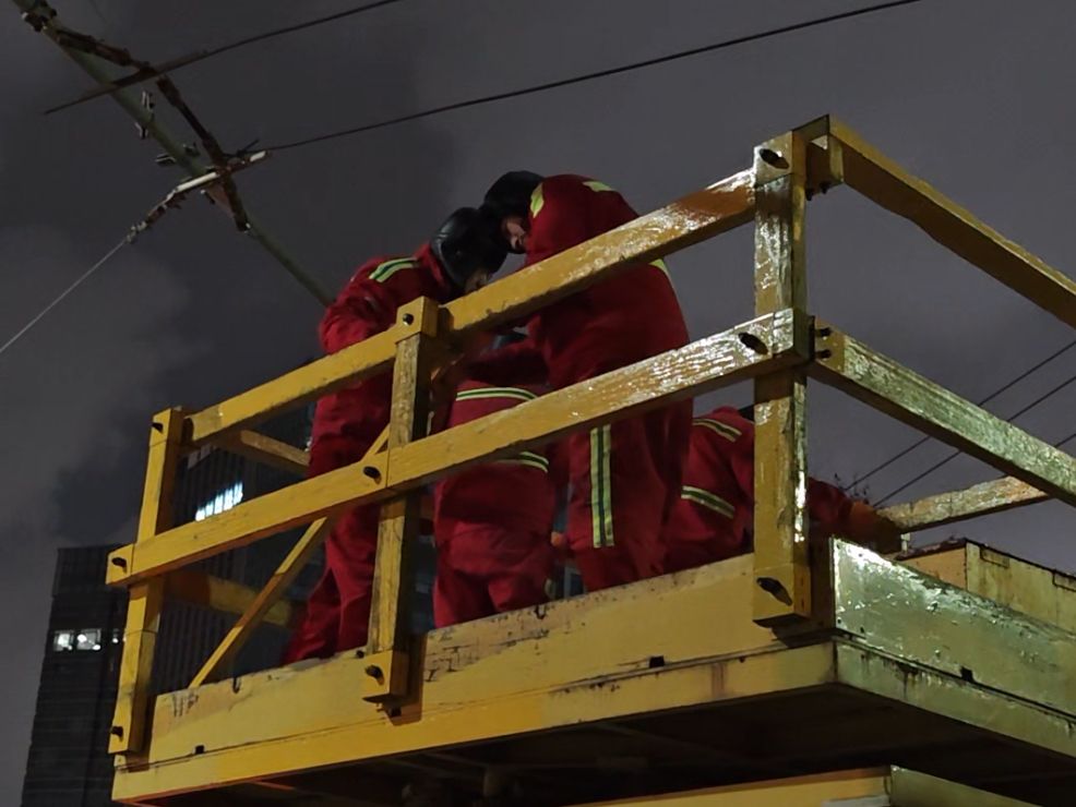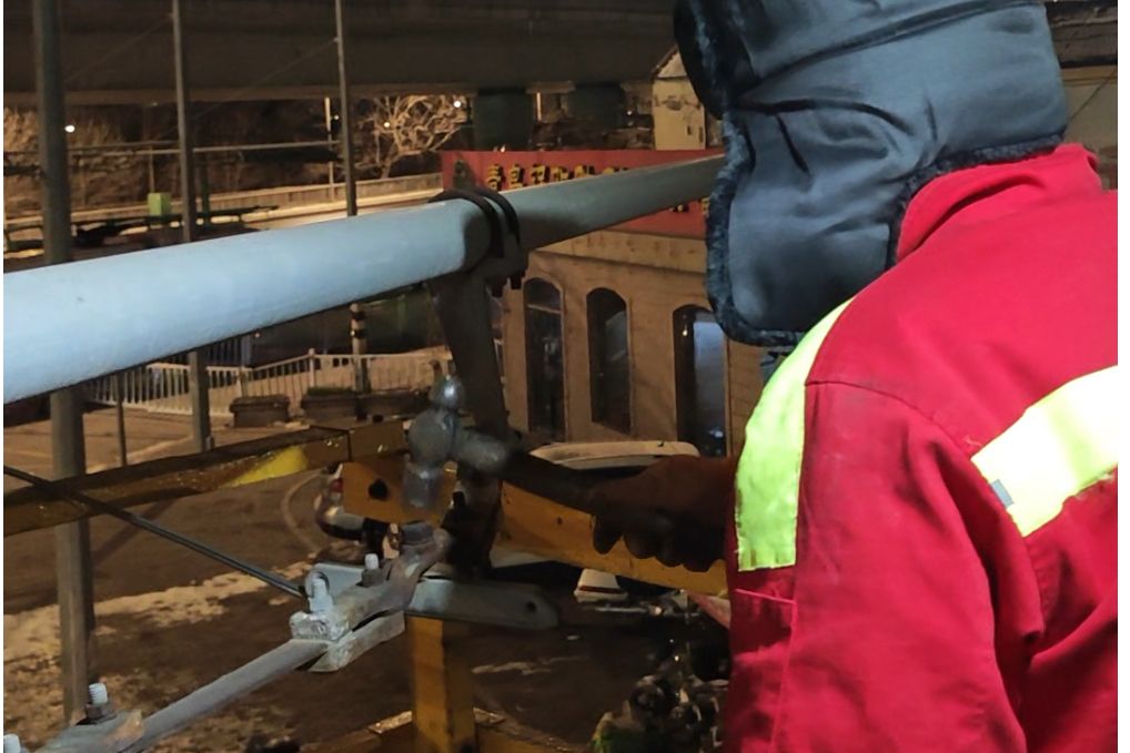 高車緩緩升起,隊(duì)員們系緊安全繩、俯身站在作業(yè)平臺上,在5米高空開展除冰作業(yè)。寒風(fēng)裹著雪粒迎面撲來,耳邊是呼嘯的風(fēng)聲與工具碰撞線網(wǎng)的清脆聲響,他們卻只能佩戴薄薄的勞保手套,確保操作時(shí)的精準(zhǔn)度。手中的工具反復(fù)敲擊滑觸線,將附著的薄冰與積雪徹底清除,同時(shí)逐一檢查并緊固夾板、螺絲等零部件,哪怕是微小的松動(dòng)都及時(shí)處理。“上半身忙著作業(yè)越干越熱,腿腳長時(shí)間暴露在寒風(fēng)里,凍得幾乎失去知覺。”老隊(duì)員高吉生的聲音因寒冷有些沙啞,卻依舊穩(wěn)穩(wěn)完成每一個(gè)操作動(dòng)作。從夜間巡查、高空除冰到部件緊固、隱患復(fù)檢,整個(gè)團(tuán)隊(duì)爭分奪秒與時(shí)間賽跑,直至凌晨3時(shí)許,全線網(wǎng)隱患排查及除冰工作全部收尾,用一夜無眠換來了首班車的準(zhǔn)點(diǎn)安全發(fā)出。