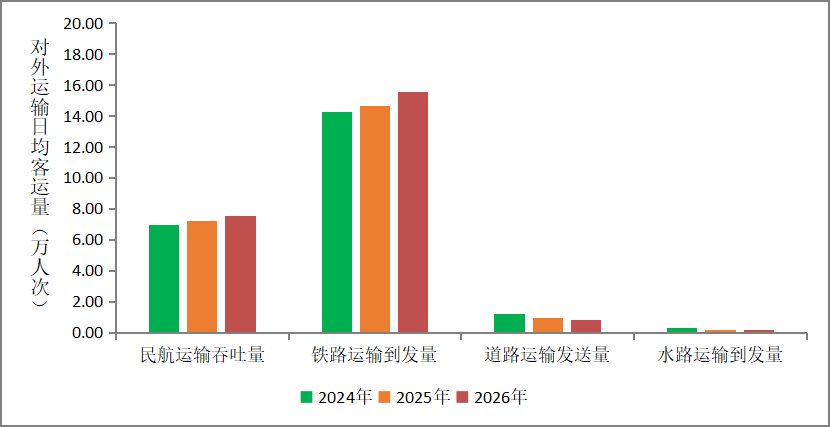 道路運輸旅客發送量將達到33.60萬人次,日均0.84萬人次,同比下降8.84%。水路運輸(國際客運)旅客到發量將達到0.16萬人次,日均40人次,同比增長2.56%。
