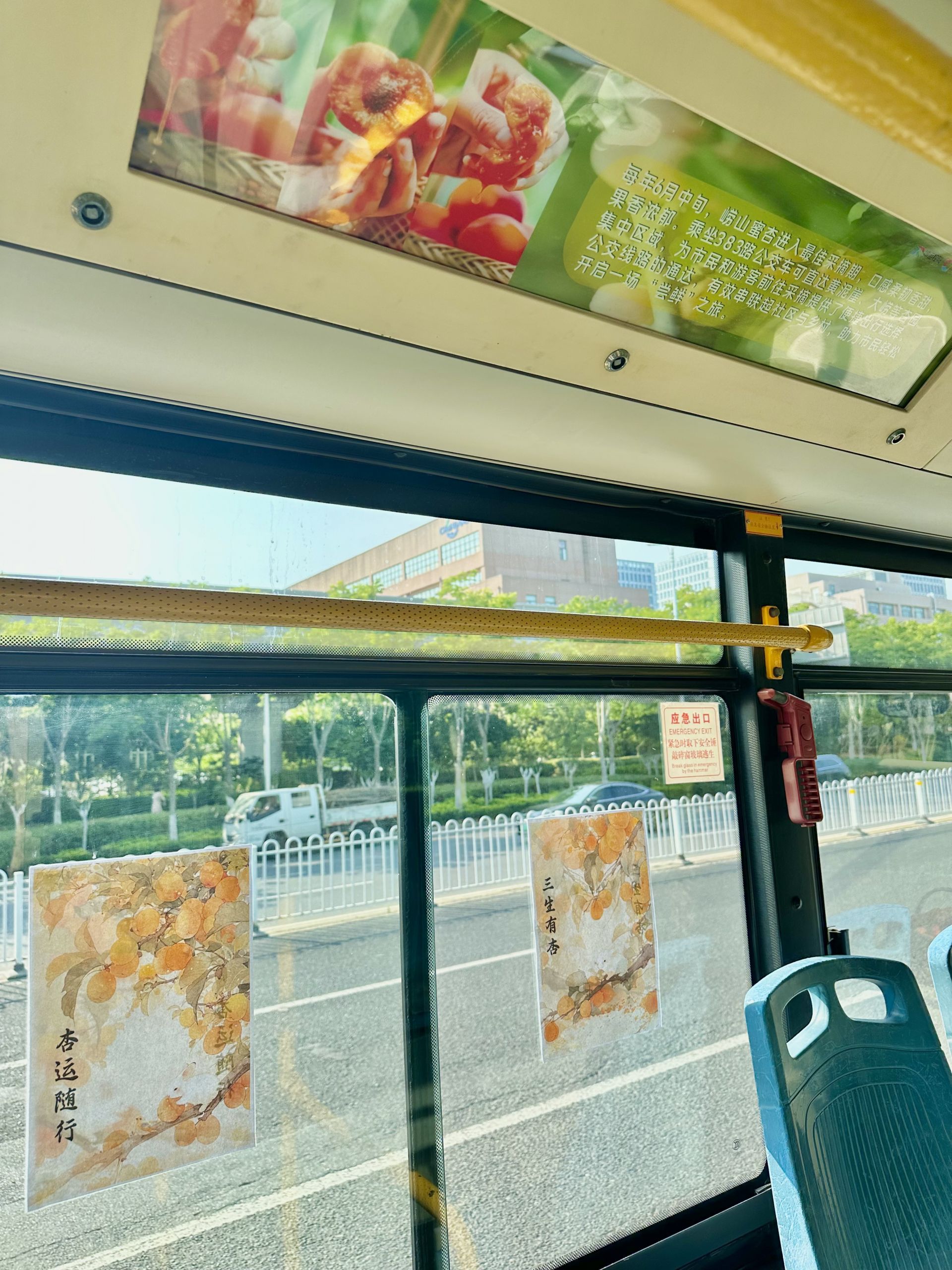 春日嶗山,櫻杏芬芳。383路敏銳地捕捉到市民近郊采摘的出游熱情,相繼推出“‘櫻’你而來”與“乘‘杏’而來,盡‘杏’而歸”主題車廂。車廂內,不再是千篇一律的廣告,取而代之的是手繪風格的沿線櫻桃園、杏園采摘等攻略圖。圖上清晰地標注了最佳采摘站點、公交接駁小貼士等信息。燈箱片、手拉寶上點綴著櫻花與杏子的剪影,乘客仿佛未到果園,已聞果香。這趟“開往春天的公交”,精準地將城市客流引向了鄉村的田間地頭,成為助農惠農的“直通車”。