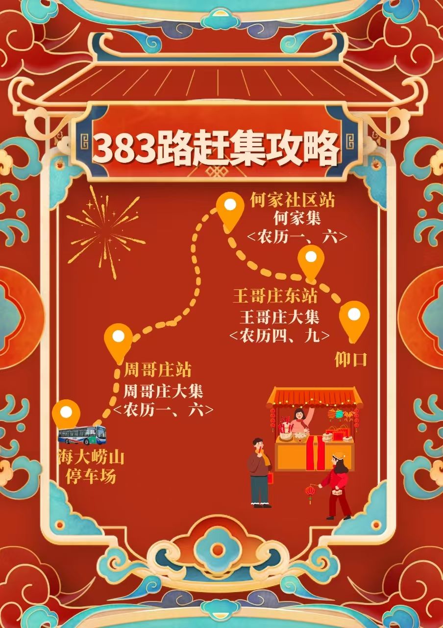 步入車廂,濃濃的年意撲面而來:車窗上點綴著迎接新年的大紅窗花,車廂中懸掛著寫滿“吉祥如意”“萬事大吉”等美好祝語的喜慶橫幅,營造出溫馨而熱烈的節日氛圍。抬眼望去,車廂中還張貼著精心制作的“383路趕集攻略”主題海報。海報不僅清晰標注了沿途可直達的各處大集,還貼心地注明了對應的公交下車站點及最佳趕集時間,讓乘客一目了然、從容規劃,輕松開啟一段充滿煙火氣的年集之旅。