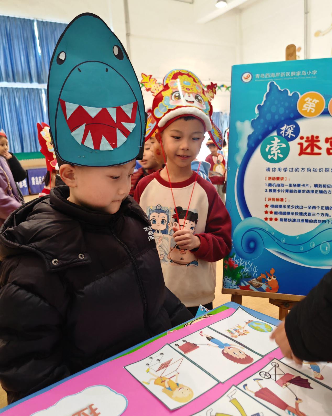 小學生頭戴海洋動物裝飾品參加闖關。