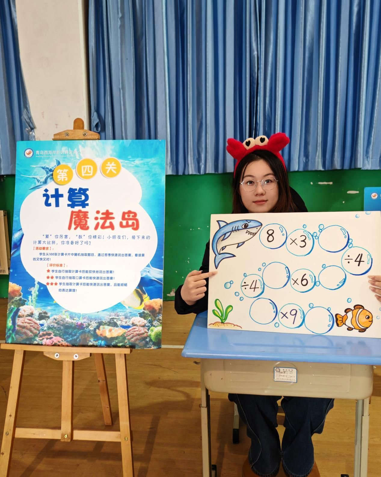 本次樂考以“海底探險”為主線,學生化身“海馬小騎士”,手持探險手冊,依次闖過九座融合多學科知識的“神秘島嶼”。各關卡設計緊密結合國家課程標準與校本特色,涵蓋語文、數學、英語、科學、藝術、體育六大領域。例如,“深海拾貝島”通過識字游戲鞏固漢字積累;“詩情畫意島”讓學生在海洋畫卷中抽取并朗誦古詩;“奇妙圖形島”“計算魔法島”則融入幾何與計算任務;“詞匯轉盤島”“妙語傳情島”鍛煉英語聽說能力;“科學探秘島”“樂海暢游島”“極限挑戰島”分別培養探究意識、音樂節奏與身體素質。