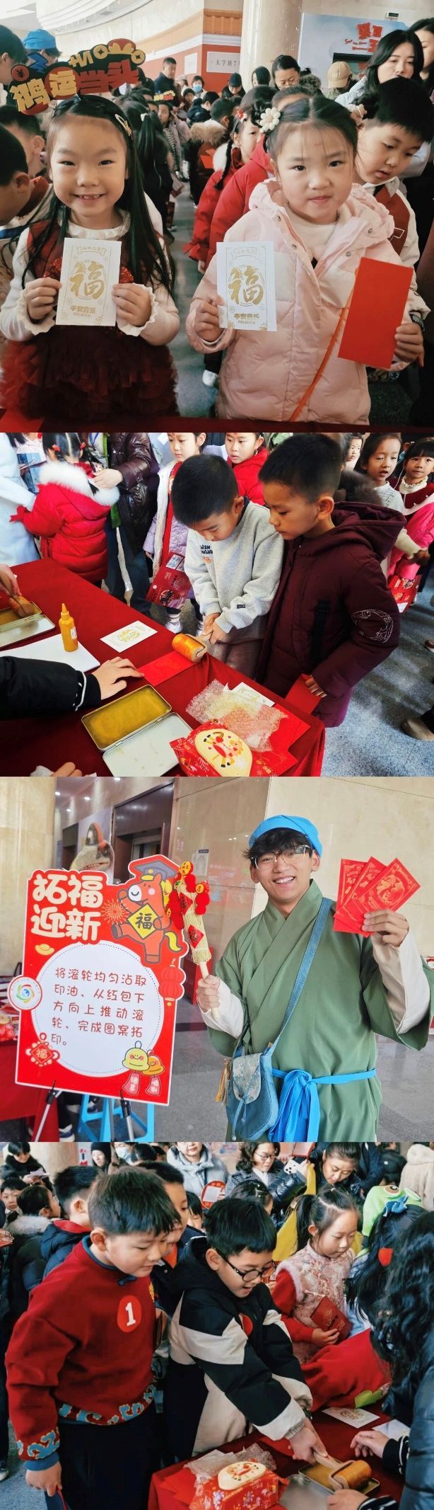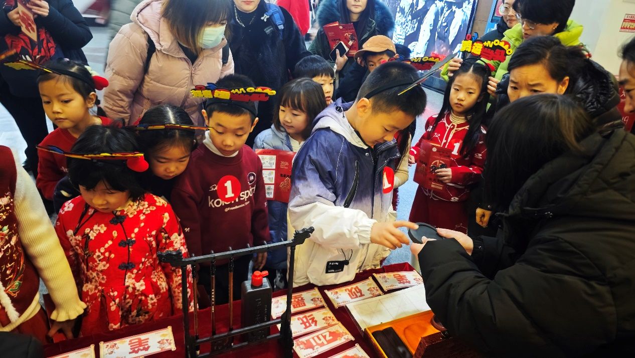 在“博古”環節,傳統文化與趣味考題深度融合,孩子們沉浸式感受歷史底蘊,與扮演“諸葛亮”的老師現場吟詩互動,在朗朗書聲中體會古典文學之美。大家參與象形字解謎游戲,從古老字形中探尋漢字的起源與演變。圍繞文房四寶開展的拼音、字義等小問答,讓筆墨紙硯成為知識的載體。孩子們還親手體驗新年紅包拓印,非遺技藝在指尖流轉,濃濃的年味也隨之彌漫開來。