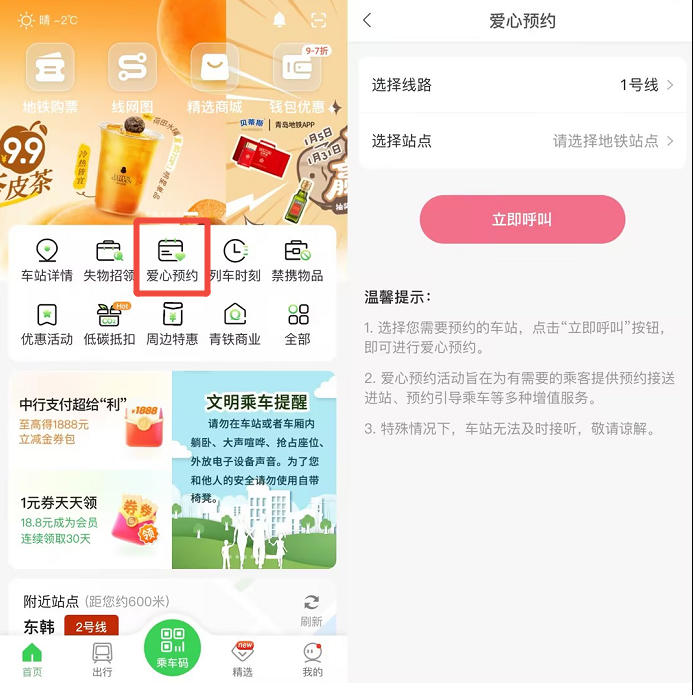對于出行不便的乘客,青島地鐵提供愛心預約服務,乘客可撥打青島地鐵服務熱線0532-55770000或在青島地鐵APP上選擇“愛心預約”功能,提前告知工作人員出行線路、出行時間等信息,車站將安排工作人員按時在約定位置等候,為乘客提供“一對一”無障礙乘車服務。