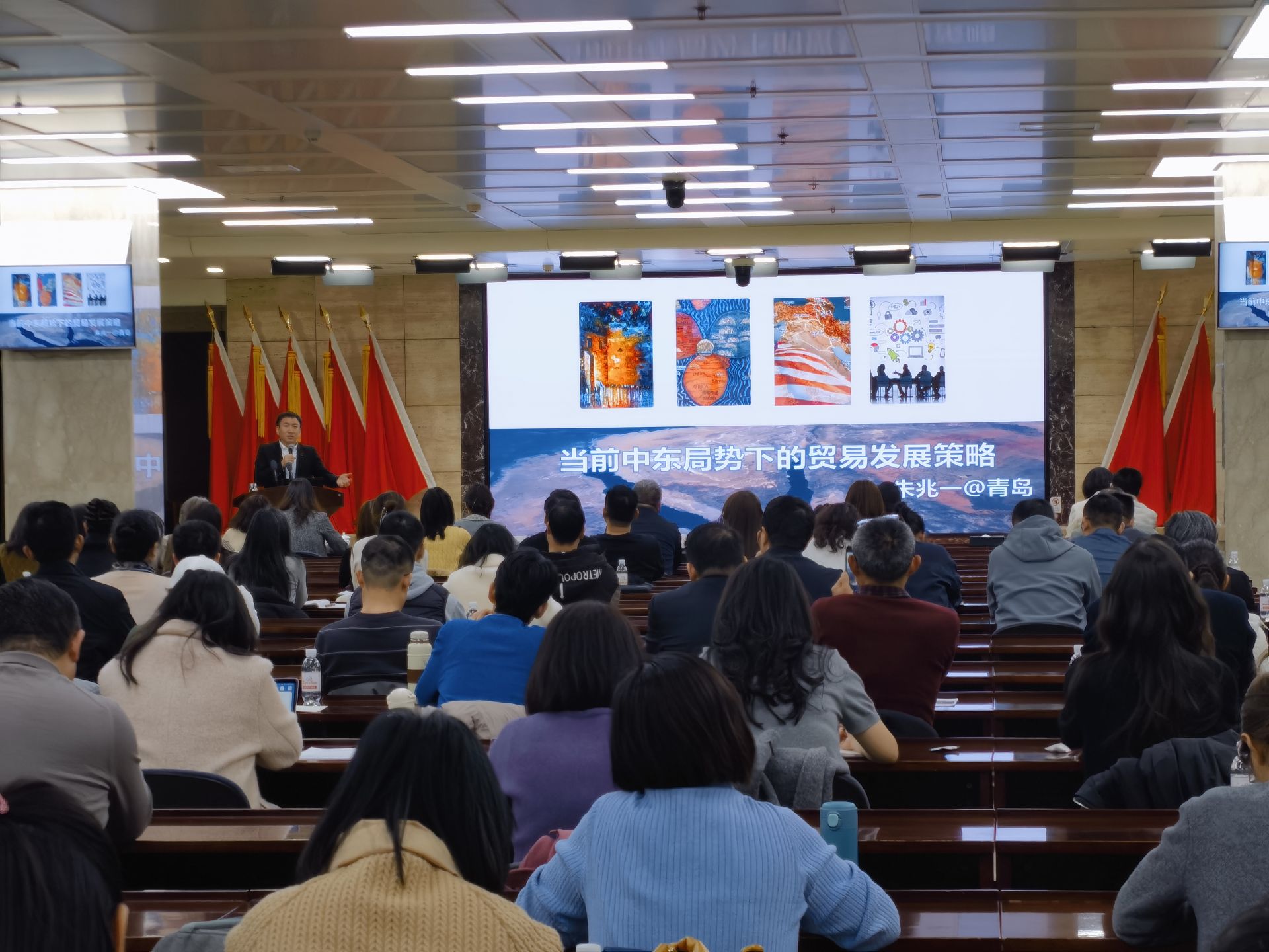 本次交流會吸引了全市外貿企業、商協會、金融機構等代表近200人參會。對外經濟貿易大學朱兆一副教授在專題演講中,系統梳理了中東局勢的歷史脈絡與現實演變,深入解讀大國戰略博弈及對全球經濟、國際貿易帶來的深遠影響,并立足青島產業優勢與外貿特色,為企業開拓中東市場提出針對性、可操作的貿易發展策略,內容務實、觀點鮮明,得到與會企業高度認可。隨后,中國銀行同步推介了跨境金融產品,為企業出海提供全方位的金融支持。