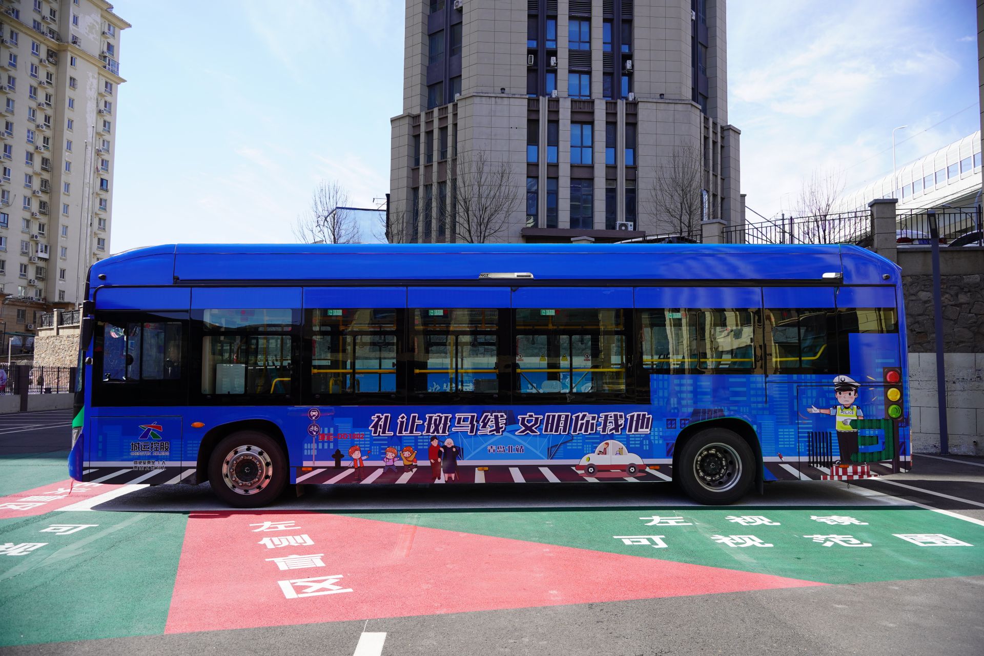 主題巴士的車體設(shè)計(jì)以醒目亮眼的交警藍(lán)為底色,格外引人注目。363路車身印有“禮讓斑馬線 文明你我他”“文明交通 人人有責(zé)”的宣傳標(biāo)語(yǔ),無(wú)聲傳播文明出行理念;368路則標(biāo)注“文明交通 禮行天下”“暢安青島 你我同行”的倡導(dǎo)口號(hào),同時(shí)搭配卡通交警形象、斑馬線、紅綠燈等元素,主題鮮明、辨識(shí)度高,成為街頭一道流動(dòng)的文明風(fēng)景線。